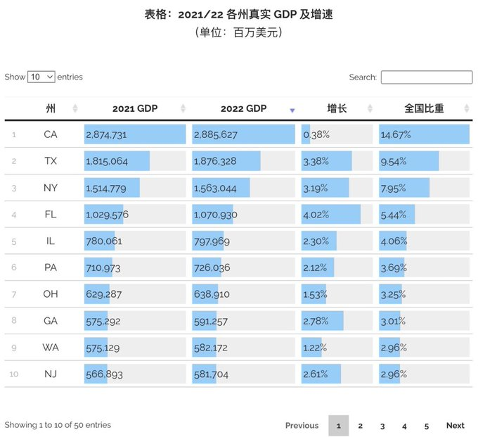 - GDP 最大的是加州,2022 年真实 GDP 2.88 万亿美元,比 2021 年增长 0.38% 。