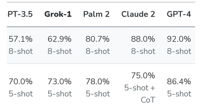Grok 经过两个月的训练,在 MMLU 基准测试中已经超越了 GPT3。